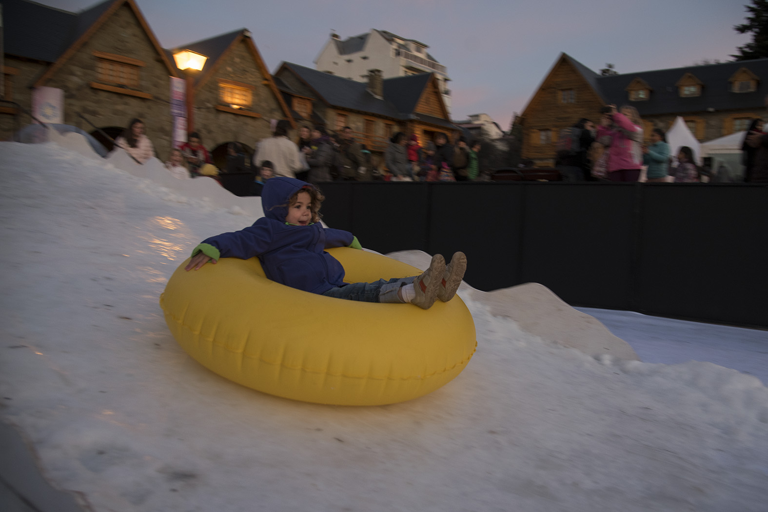 La Expo Nieve tuvo su apertura oficial y fue seguida de cerca por residentes y turistas. Mientras la globa que se instaló frente a la Intendencia ofrecía conocer otros destinos turísticos de la región, en las afueras los chicos hicieron fila para no perder la oportunidad de arrojarse colina abajo.