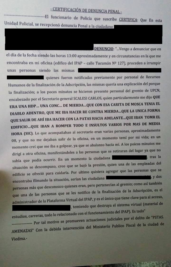 Tras el escandaloso hecho que se registró en las instalaciones del Instituto Provincial de la Administración Pública (IPAP) en Viedma, donde se vieron involucrados trabajadores de esa dependencia y el dirigente de UPCN, Juan Carlos Scalesi y que terminó con una denuncia, UPCN salió a responder.