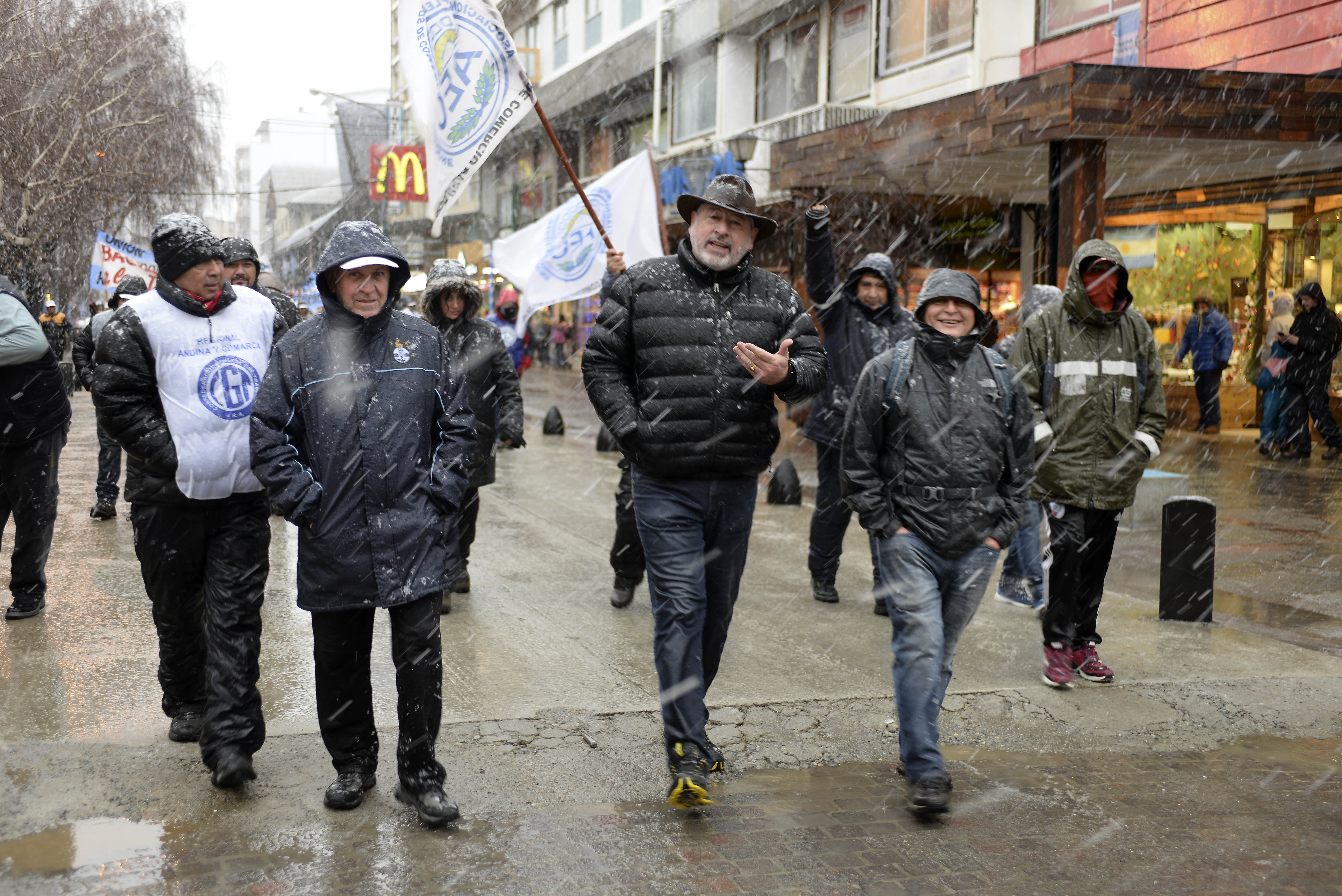 Los dirigentes y choferes partieron bajo la nieve desde Onelli y Moreno a media mañana y avanzaron con pancartas y banderas hasta el Centro Cívico. Junto a Marcelo Iarlori, el secretario general de UTA, caminó el dirigente mercantil Walter Cortés y otros referentes de la CGT.