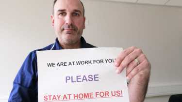 “Estamos trabajando para vos, por favor quedate en casa por nosotros”. Joan Pons Laplana sostiene un cartel entre las manos con una leyenda que ha sido casi una plegaria del personal médico del mundo entero ante el coronavirus, ese monstruo invisible, invasivo y letal que ha partido en dos nuestra historia contemporánea.