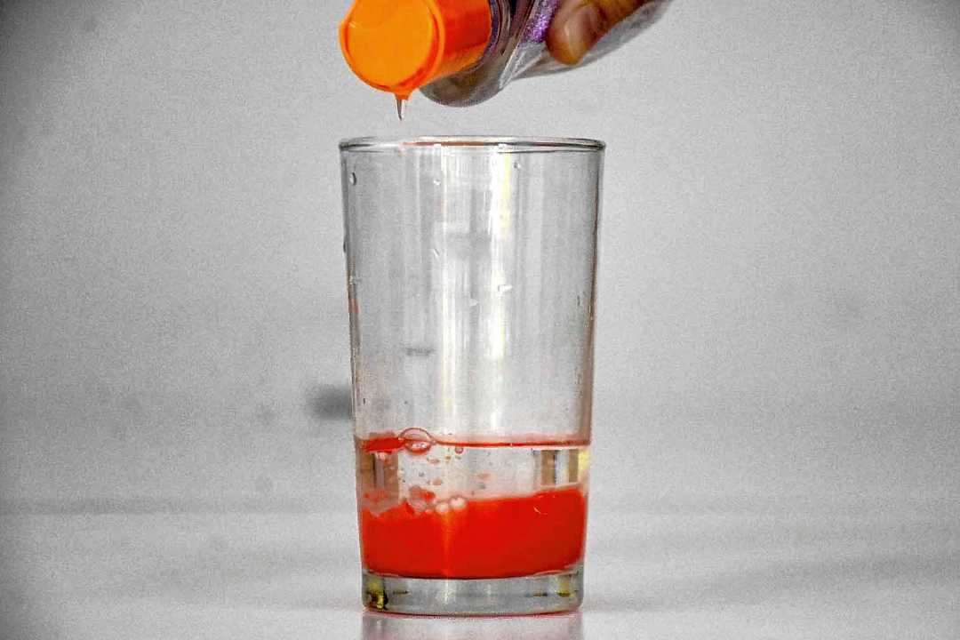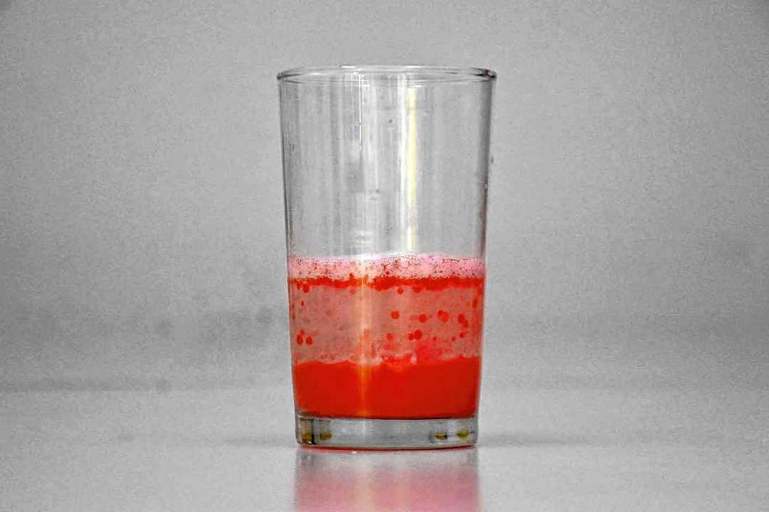 El agua y el aceite no se mezclan y como el aceite es menos denso que el agua, queda flotando. El colorante rojo es soluble en el agua, por eso tiñe la parte de abajo. Y cuando agregamos el efervescente empieza a liberar burbujas de dióxido de carbono, a reaccionar con el agua.