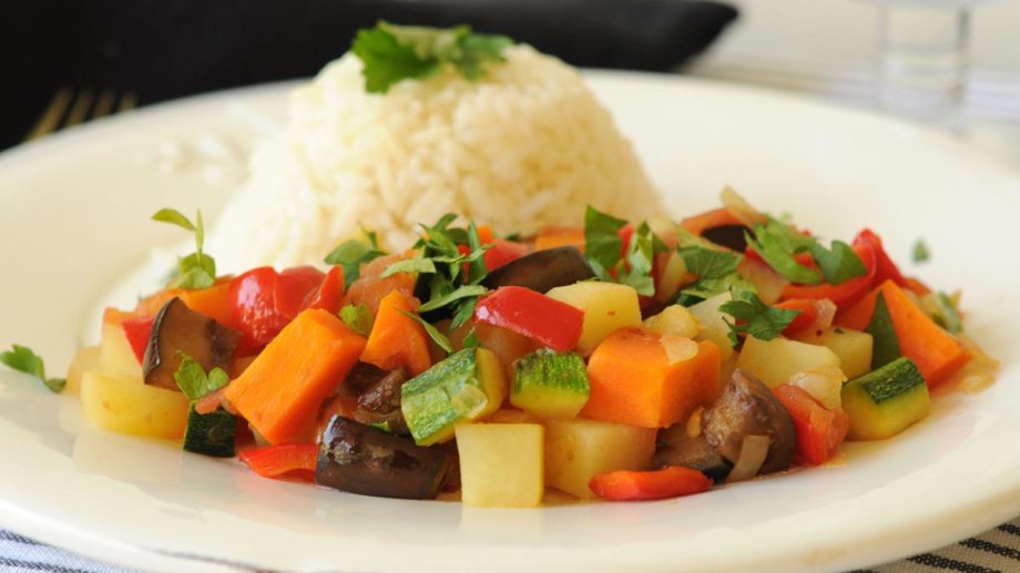 Lavar todas las verduras, secarlas y pelar la papa, las cebollas y los tomates a los que habrá que sacarle las semillas también. Después cortar las berenjenas en dados grandes, las cebollas en aros finos, los morrones en juliana, el apio y el tomate en cubitos, y los zucchini y la papa en cuadrados medianos.