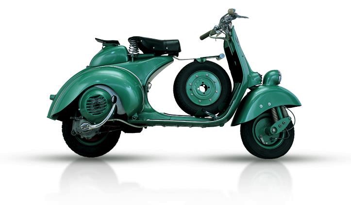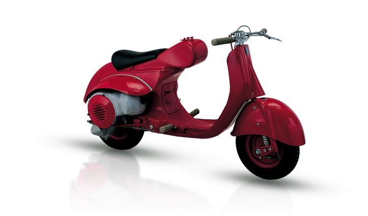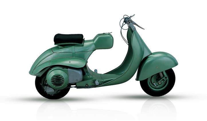 1946: Esta moto ligera se presenta por primera vez al público en el círculo de golf de Roma. En el escudo aparece por primera vez el nuevo logotipo Piaggio que sustituye al emblema aeronáutico. Los primeros cincuenta ejemplares salen de la fábrica de Pontedera mientras se hace la presentación oficial. La red de concesionarios Lancia es la encargada de comercializarla durante meses y, en su primer año, se producen 2.484 vehículos.