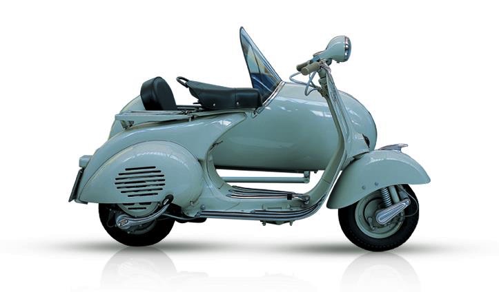 1955: A finales de 1954 Piaggio lanza la primera Vespa de cilindrada 150, previendo también el modelo sidecar, apreciado por la línea aerodinámica y elegante. El asiento lateral de chapa de acero se ensambla manualmente y se conecta a la moto con un único tubo. Esto es una solución exclusiva de Piaggio que prevé además la sustitución de las relaciones del cambio para que sea más fácil superar grandes desniveles.