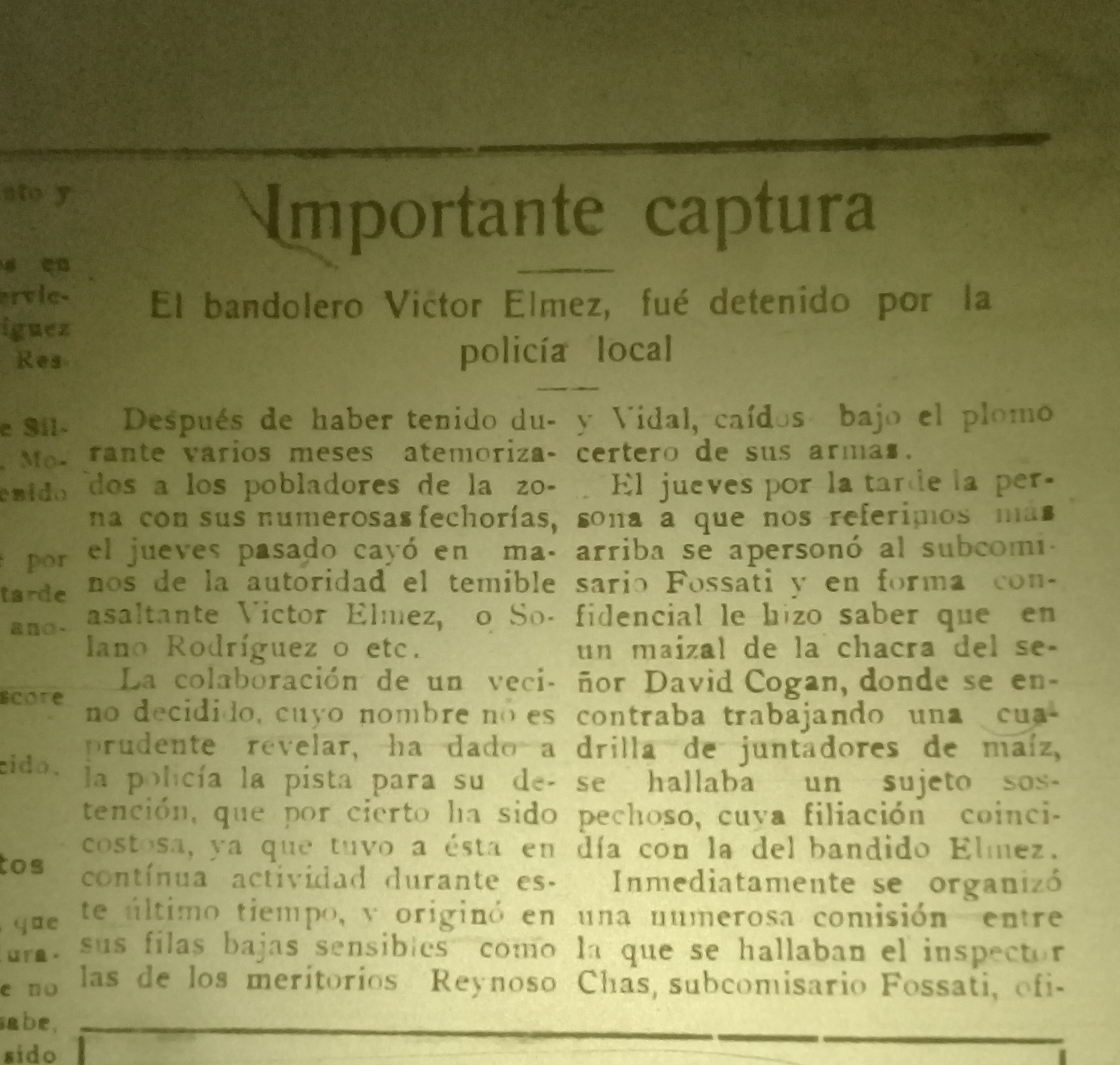 El año 1932 lo puso en el semanario “Río Negro” como protagonista, cuando el 29 de marzo hirió de muerte a Narciso Vidal, el policía de 20 años que encabezaba el incipiente destacamento de Cervantes. El agente volvía de visitar a los hermanos Zamboni, que vivían en su jurisdicción, cuando vio pasar al bandolero junto a otros y sospechó. Conociendo sus antecedentes, le dio la voz de “¡alto!”, pero la reacción derivó en los disparos mortales.