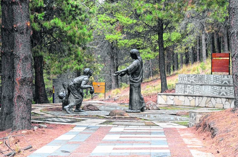 La guía recorre algunas estaciones. Relata que en la 7, hay personajes agarrados de la mano mirando hacia arriba. “Es la estación del Padre Nuestro, de la oración universal. Está basada en la cultura africana, la oriental, la cristiana, la musulmana, judía, mapuche”, describe para asegurar que Dios es el mismo y que el parque tiene la riqueza de situarnos en nuestro tiempo.