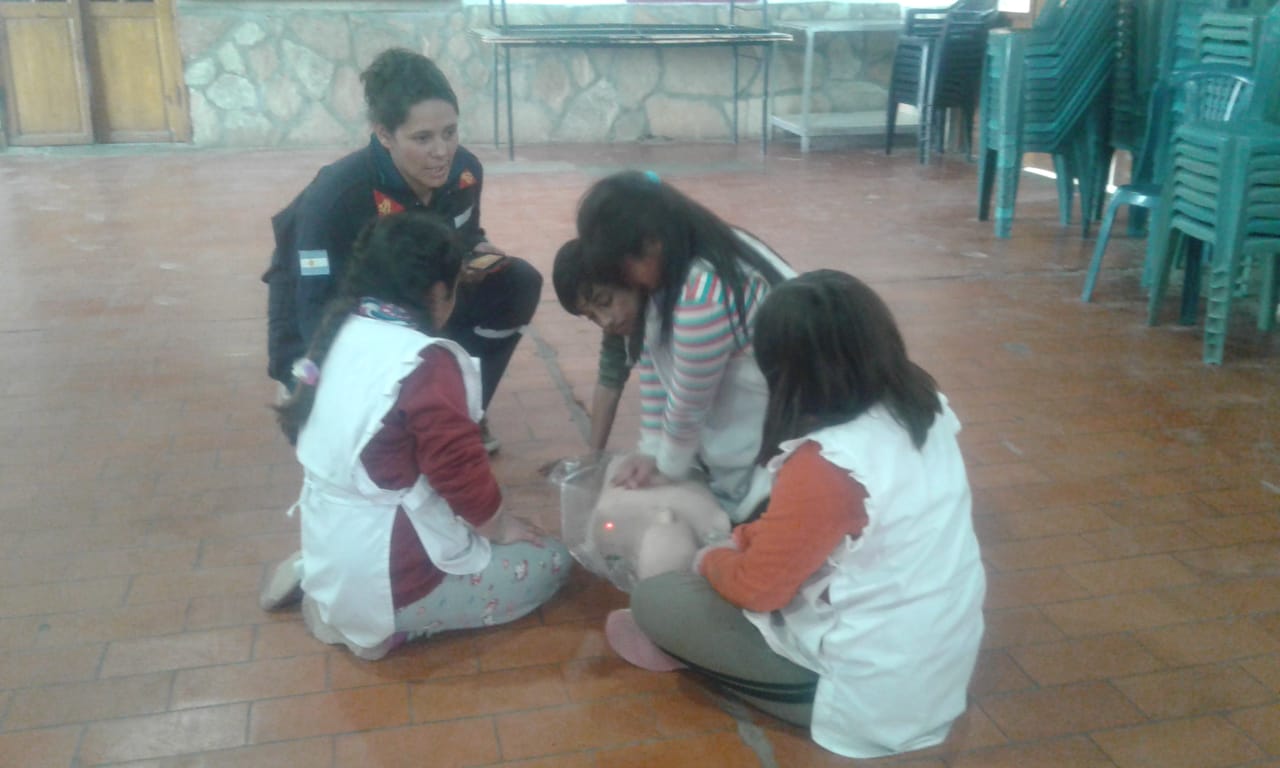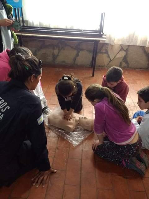 Con sus pequeñas manitos, aplican las técnicas sobre juguetes. Los ayudan a memorizar el número de emergencia. Además se capacitó a adultos y secundarios, para que todo el pueblo conozca las maniobras.