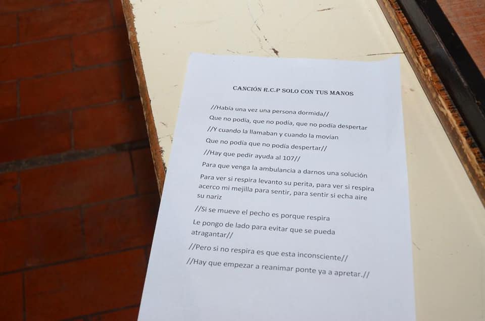 Mientras uno de los bomberos toma la guitarra, los niños y niñas hacen lo propio con sus bebés y peluches de juguete. Se acomodan en ronda y las bomberas empiezan a entonar una canción particular: la que enseña técnicas de reanimación cardiopulmonar (RCP).