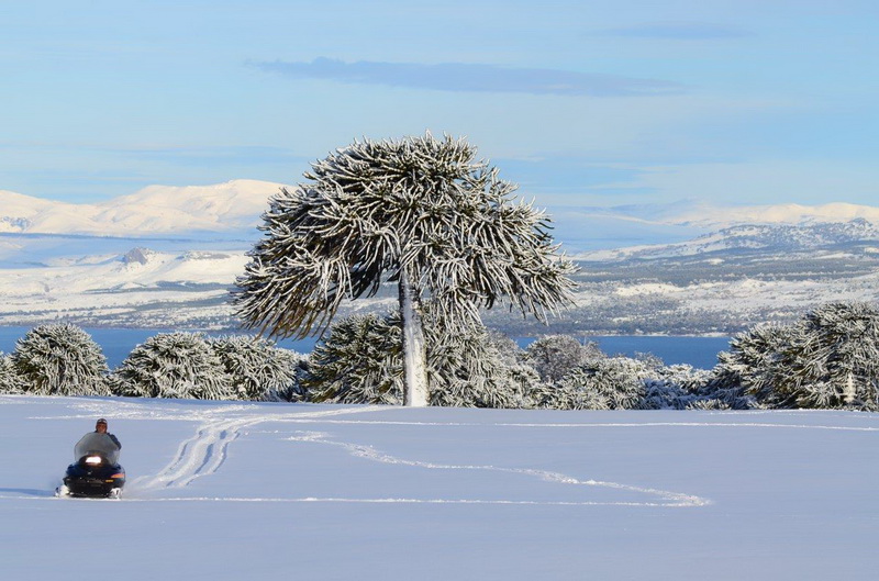 Uno de los conductores es Claudio, que está aquí hace 19 años. Manejó los medios, fue encargado y ahora está con las motos. La excursión que coordina con su hermano Alejandro parte desde la base del cerro ubicado a 9 km de Villa Pehuenia (1.550 metros) y es de alrededor de una hora, ida y vuelta hasta el cráter dormido del volcán (1650 metros), sobre el que ahora hay una laguna congelada.