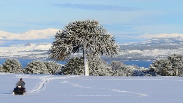 Con "Motos de nieve Los Peñis" arman las travesías al ojo del volcán donde ahora hay una laguna congelada. Claudio y Alejandro son hermanos e integran la comunidad Puel, que maneja el centro invernal a 9 km de Villa Pehuenia. No te pierdas el video en espectaculares paisajes.