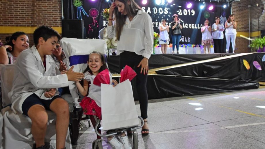 Con su sonrisa amplia, y el cariño de sus compañeros y docentes, finalmente Camila pudo recibir anoche su título de egresada de 7° de la Escuela 42, tras la construcción de una rampa solidaria que le permitió subir al escenario a recibir su diploma y el abrazo de sus maestras.