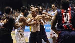 El escándalo se produjo en el segundo cuarto, cuando restaban 1m. 54s. para el cierre, en momentos en que el norteamericano Roquez Johnson, de San Lorenzo, y el capitán Leonardo Gutiérrez, emblema del conjunto marplatense, se agredieron mutuamente.