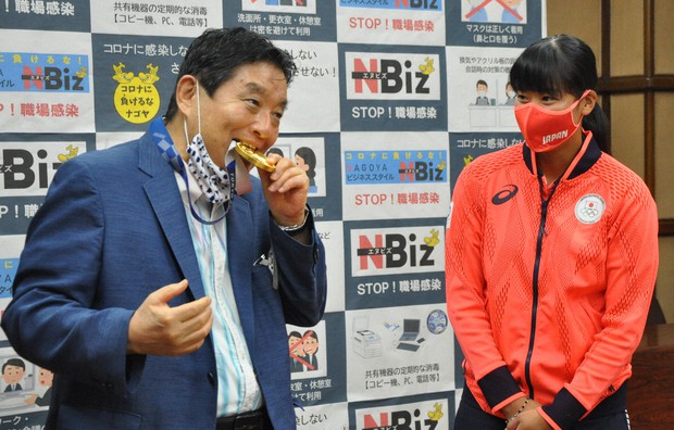 En un evento celebrado la semana pasada para celebrar el logro de Miu Goto en los Juegos de Tokio 2020, Takashi Kawamura, alcalde de la ciudad de Nagoya, en el centro de Japón, se quitó la máscara y se puso la medalla de oro entre los dientes.