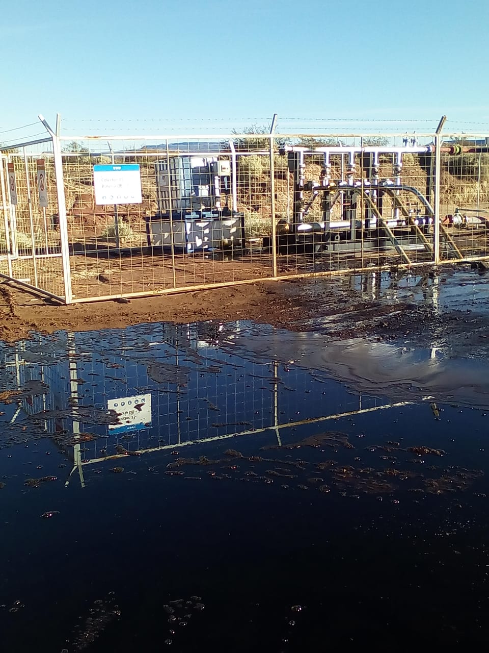 Fuentes de la empresa indicaron que hubo un desperfecto en un colector de una batería, lo que produjo un spray de hidrocarburo que afectó al suelo lindante de manera superficial, pero sin acumulación, y ya se está trabajando para remediarlo. Sin embargo, testigos aseguran que el líquido sí se acumuló y que el río se encuentra a unos 250 metros, aunque desde la petrolera afirmaron que no la pérdida no llegó al agua.