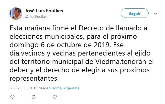 El intendente Jose Luis Foulkes convocó hoy a elecciones en Viedma para el domingo 6 de octubre, ratificando su adelantamiento del comicio presidencial previsto para el 27 de ese mes.