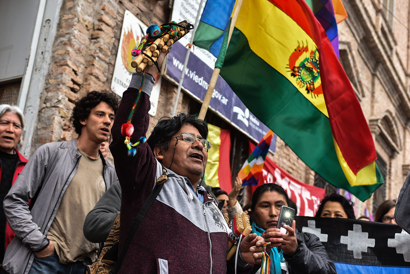 Una concurrida manifestación pacífica pidió frente a la sede del Consulado de Bolivia en esta capital por la restitución de Evo Morales en la presidencia de ese país. Con quejas a voz en cuello, gritos tradicionales y el sonido de zampoñas, quenas y bombos, la comunidad del altiplano, organizaciones sociales y políticas expresaron su enojo contra los intentos golpistas.