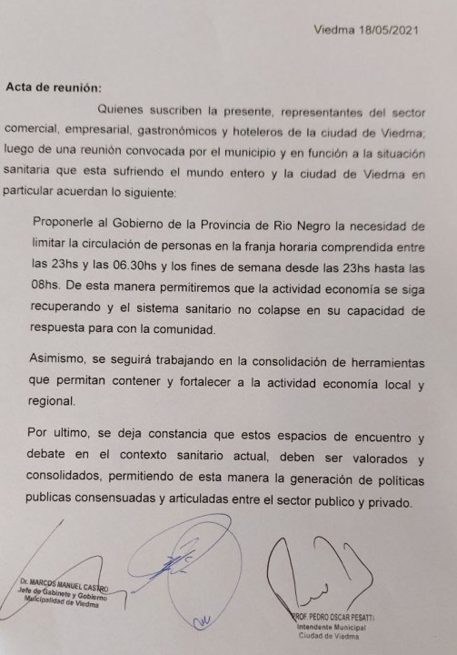 El gobierno de Viedma y este sector económico, solicitan al gobierno de Río Negro limitar la circulación de personas en la franja horaria comprendida entre las 23 y 6.30 los días de semana y de 23 a 8 los sábados y domingo.