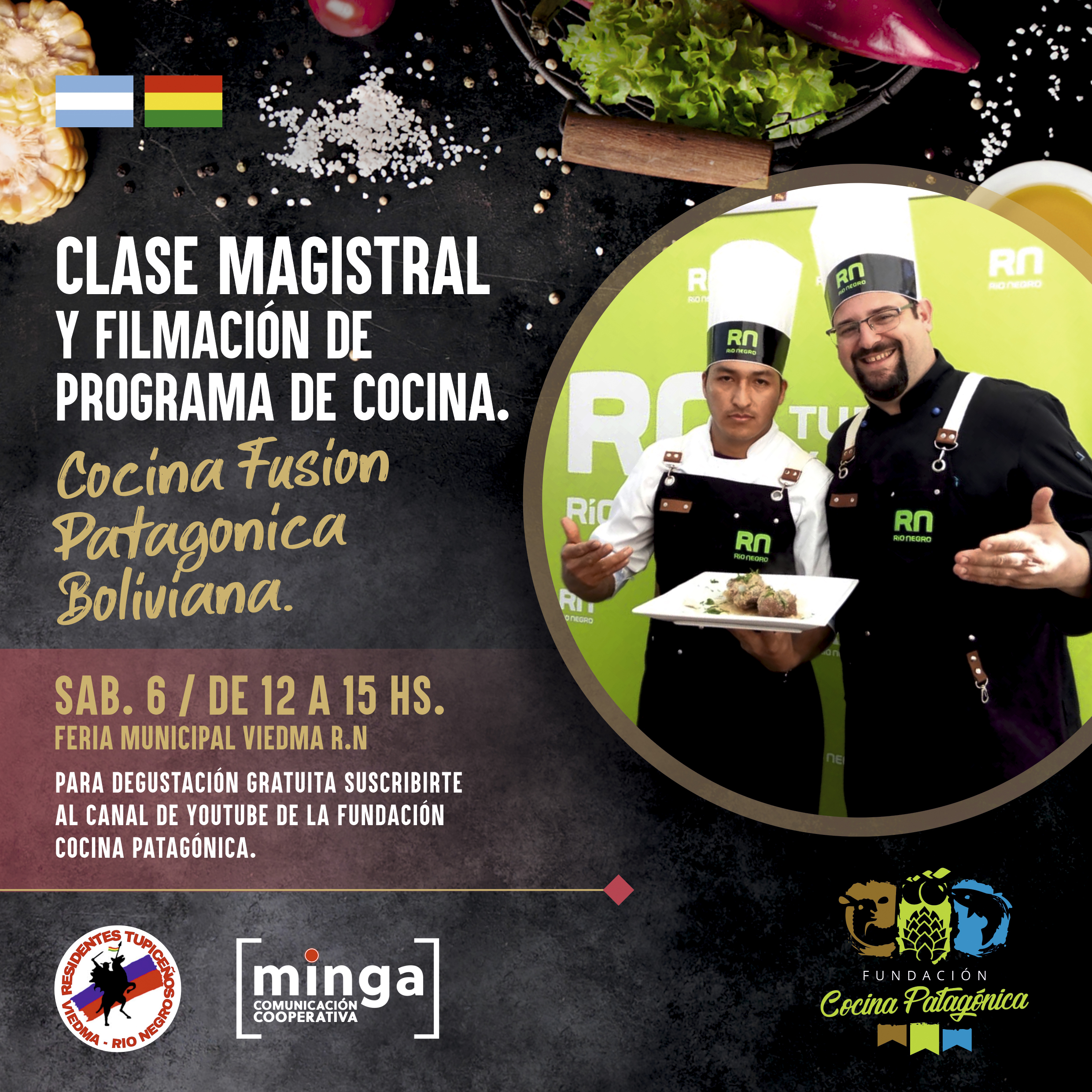 La Fundación Cocina Patagónica junto a la comunidad boliviana de la ciudad de Viedma realizará una demostración de cocina fusión patagónica – boliviana y grabación de un programa de cocina en la feria municipal de la ciudad capital, el próximo sábado 6 de noviembre, donde cocinarán los chefs Francisco Ventura por la Fundación y el chef Santos Cari por la comunidad boliviana. El evento será a partir de las 11 de la mañana con entrada libre y gratuita.