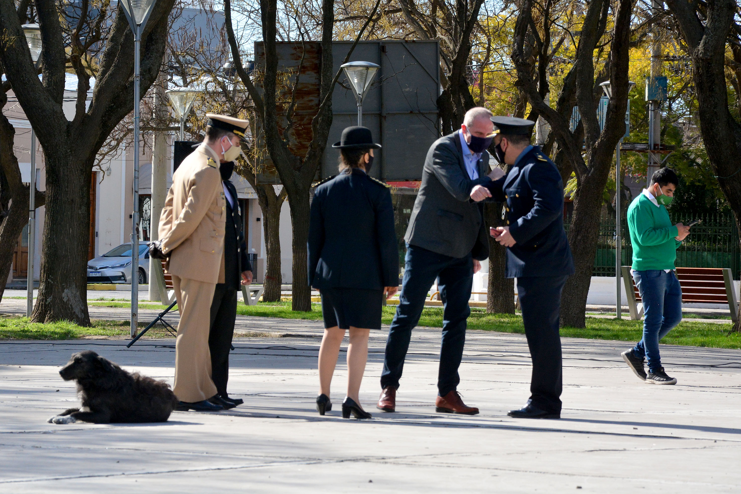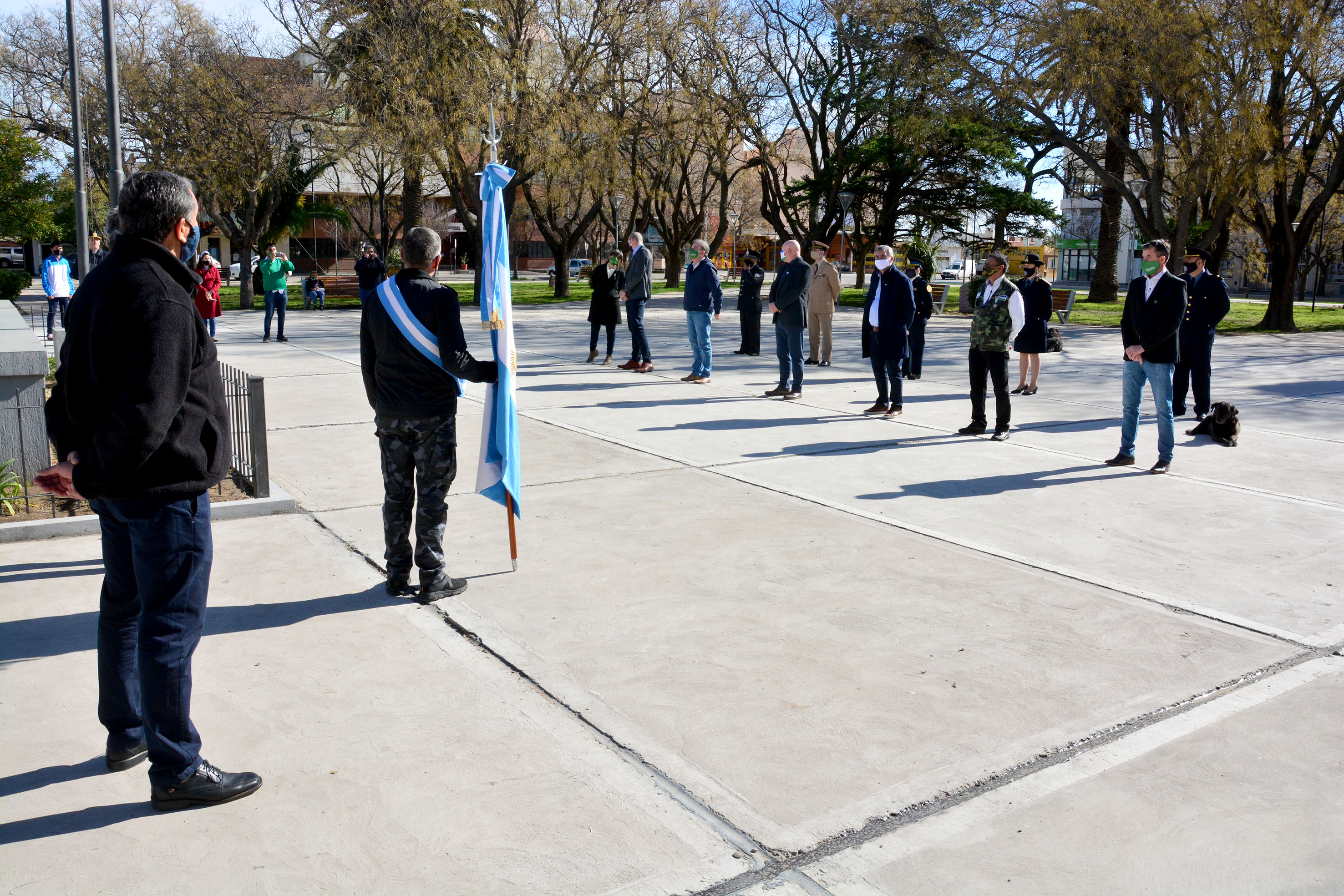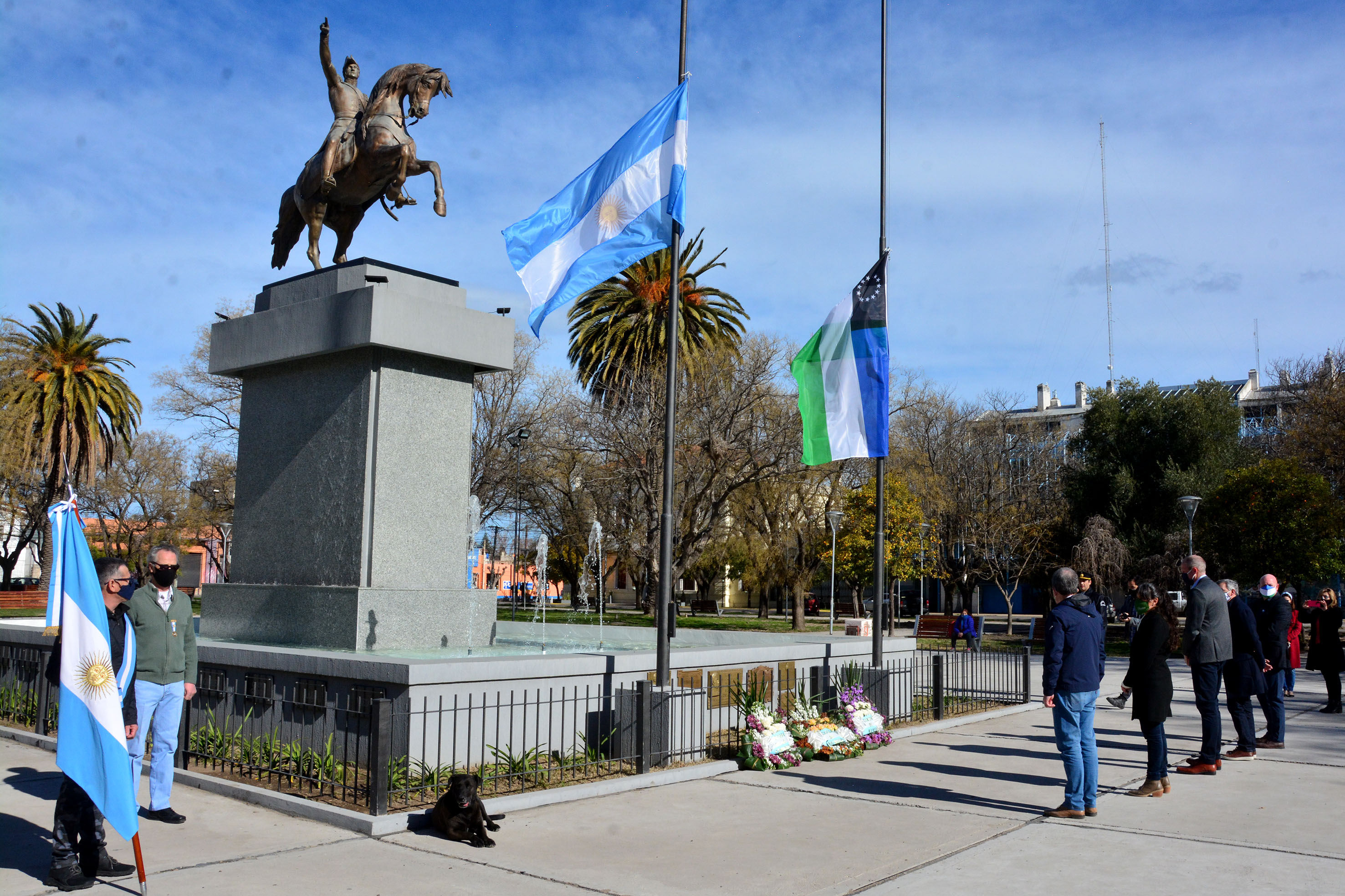 El padre de la patria tuvo su acto en la plaza de la capital rionegrina. Las imágenes de un acto reducido por la pandemia del coronavirus.