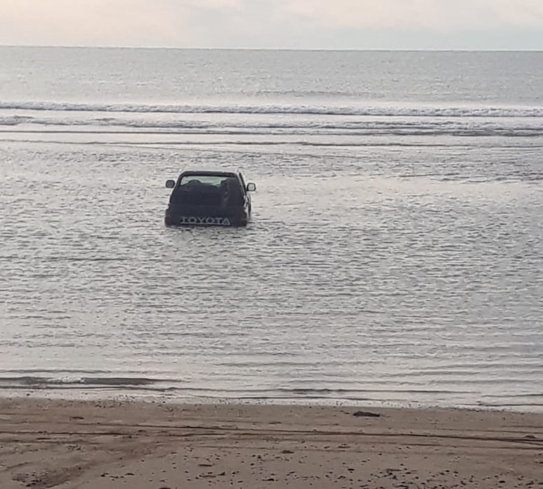 El dueño de una camioneta Toyota se vio en problemas cuando fue a pescar al balneario El Cóndor. Cuando se disponía a bajar la lancha, se encajó en la arena de la tercera bajada denominada Erica. Los desesperados intentos de sacar la camioneta fueron nulos y el agua lo rodeó rápidamente por la pleamar.