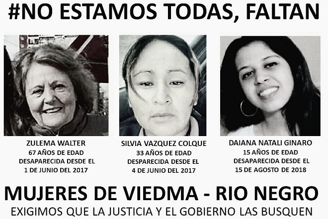 Zulema Walter (1 año y 4 meses desaparecida): El 1 de junio de 2017 la docente jubilada desapareció de su hogar en Viedma alrededor de las 10:30 y nada se sabe de ella. Se hicieron rastrillajes, revisaron cámaras de seguridad por la zona donde posiblemente se movilizó, se tomaron testimonios e inclusive se convocó a la División Canes para seguir los rastros. Se trabajó sobre la zona de costanera, en el sector del río Negro, por debajo del puente Ferrocarretero.