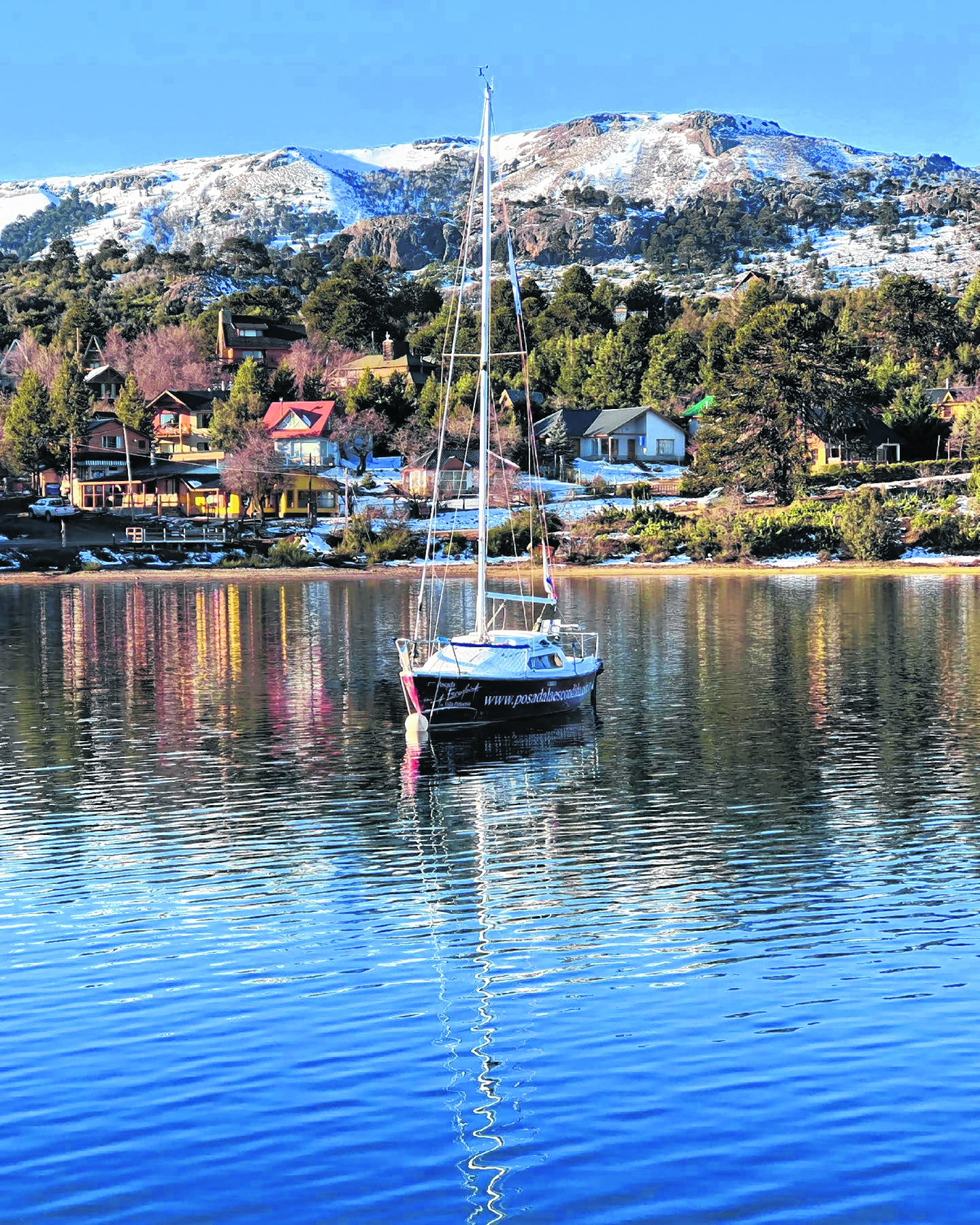 Muy cerca, hay algunas mesas entre la nieve. Una pareja se sienta allí a tomar un chocolate caliente, mientras un muñeco de nieve, de gorro y bufanda amarilla, los mira con sus ojos de tapas de Coca Cola. Desde el muelle de madera, algunas embarcaciones salen a recorrer el lago Aluminé. Al bajar los escalones para subir al barco, en el agua cristalina se ven los peces a la perfección.