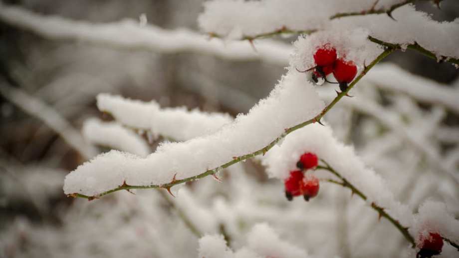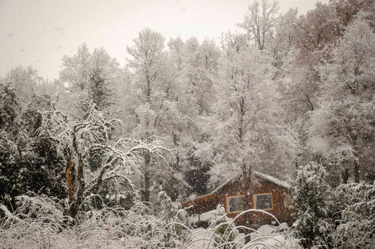 Hermosas postales en el comienzo del invierno en esta aldea de montaña neuquina. Con bayas de rosa mosqueta y pinos y robles cubiertos de copos blancos.