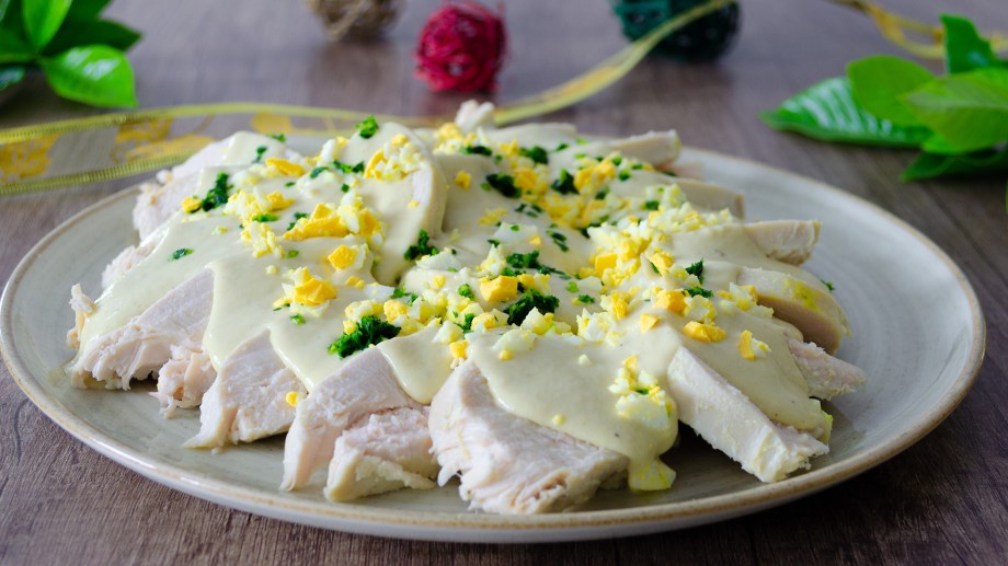 Una vez que las pechugas están frías, cortarlas en rodajas, colocarlas en una fuente y salsear por arriba. Para decorar colocamos perejil picado, ajo picado y huevo picado.