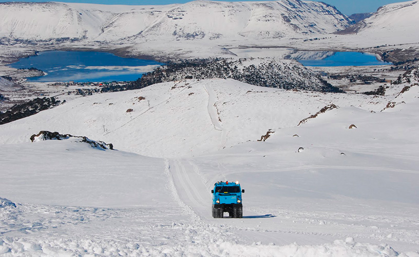 La excursión preferida de los visitantes es al cráter dormido del volcán, hoy tapado por una laguna congelada. Por eso se les ocurrió sumar otra alternativa. Como en el esquí acuático pero en la nieve, llevan atadas a las motos la sogas que toman los esquiadores y snowboarders que surfean en las laderas fuera de pista del parque de nieve.