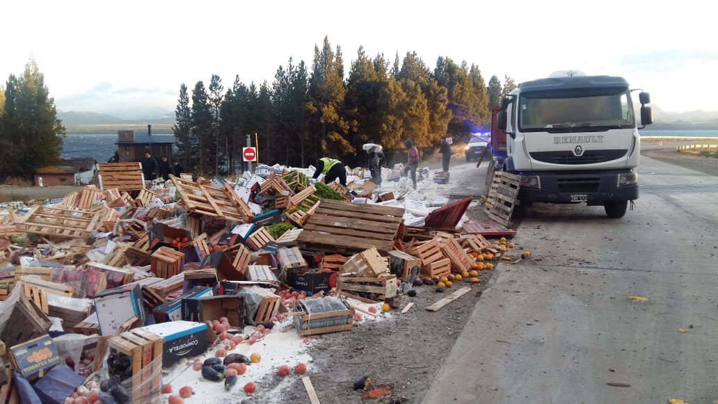 Un camión cargado con harina, frutas y verduras que transitaba en el acceso este de Bariloche sobre la ruta 40 perdió el control y volcó su cargamento en la banquina.
