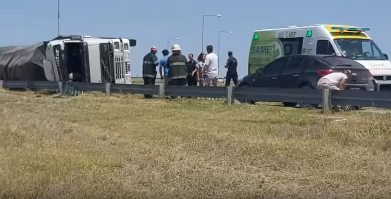 El vuelco, cuyo origen se desconoce, tuvo lugar en este domingo en la rotonda de la ruta nacional N° 3 y avenida de la Constitución, y en momentos que el transporte ya había traspuesto el puente Basilio Villarino sobre el río Negro.
