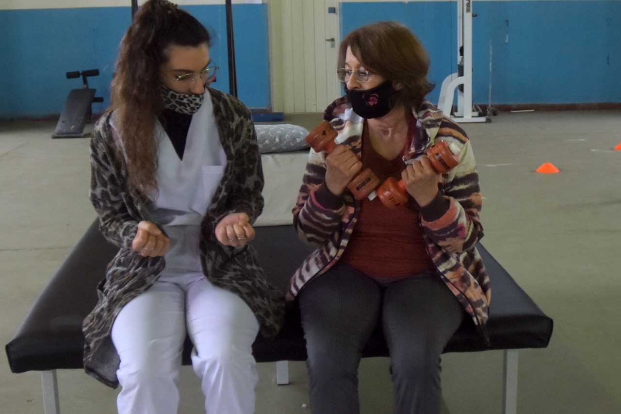María Mercedes Rostoll levanta con fuerza las mancuernas mientras la supervisa su kinesióloga Anabela Martínez. A sus 70 años, esta luchadora de Allen a la que todos llaman Cotita, está aprendiendo de nuevo a caminar luego de estar cuatro meses internada en terapia intensiva tras contagiarse de coronavirus.