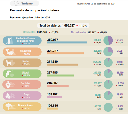 El informe del INDEC revela que las pernoctaciones, una métrica clave para evaluar la actividad turística, también sufrieron un fuerte descenso del 12,5% en comparación con julio de 2023. Esta disminución afectó tanto a los viajeros residentes como a los no residentes, con caídas del 13,4% y 8,9% respectivamente.