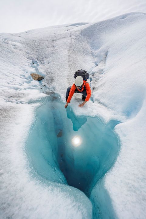 Entre ambas, hay un punto intermedio, el mini trekking 2, que permite explorar otra zona del glaciar, con cascadas y formaciones diferentes. “Es un recorrido más ligero, explica, de unos cinco kilómetros que se caminan en una hora y media. Es muy lindo, porque muestra otra cara del hielo».