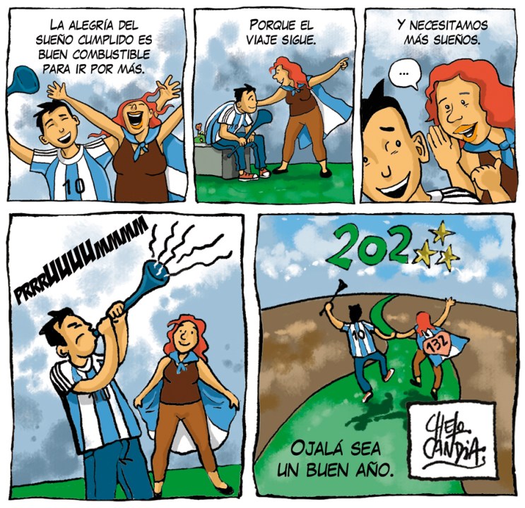 «Un buen año» el capítulo 472 de la tira de Chelo Candia que publica el Voy, suplemento de viajes y turismo de Río Negro.