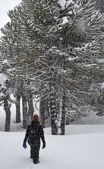Vas a ver mujeres y hombres que van al almacén esquiando, chicas y chicos que visitan amigos sobre las tablas o se divierten con las pendientes de las calles cubiertas de nieve, copos blancos que se posan sobre el verde intenso de las araucarias milenarias y autos y camionetas que asoman en el manto blanco.