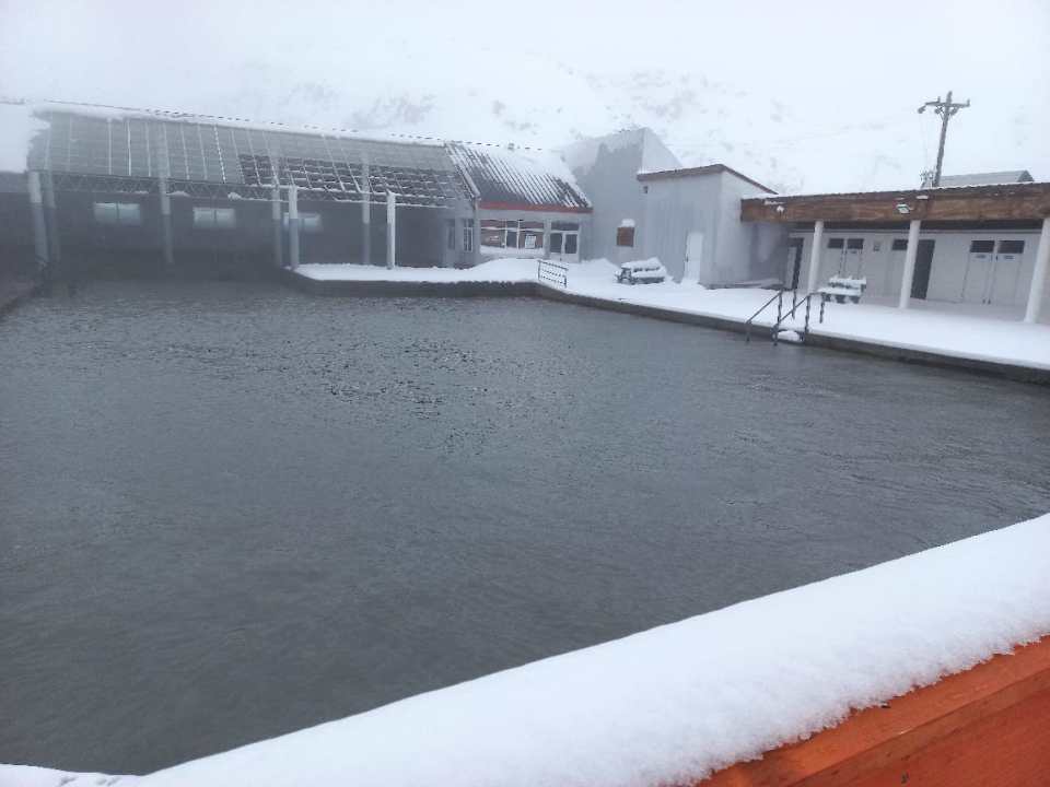 Con las nevadas las lagunas permanecen a la vista por la alta temperatura de sus aguas, pero el complejo termal que las rodea, las cabañas y las hosterías quedan bajo el manto blanco que cubre todo desde el otoño hasta casi el comienzo del verano.
