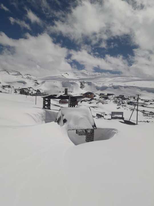 El martes por la mañana, Nico Canter, único habitante civil de Copahue. la villa termal de la cordillera de Neuquén que queda cubierta por la nieve durante el invierno y entrada la primavera, salió a dar una vuelta con su tabla splitboard, a la que puede transformar en dos esquíes o una de snowboard según lo que quiera hacer. Desde lo alto de una ladera cercana, filmó un video y tomó fotografías que muestran el inmenso manto blanco que lo cubre todo: las instalaciones y los consultorios donde los turistas reciben los tratamientos termales, las cabañas, las hosterías, todo menos las lagunas que por su temperatura no dejan que se acumule la nieve ni se congelan como Las Mellizas, a 5 km, donde efectivos del Ejército hacen la campaña preantártica para acostumbrarse a las condiciones extremas.