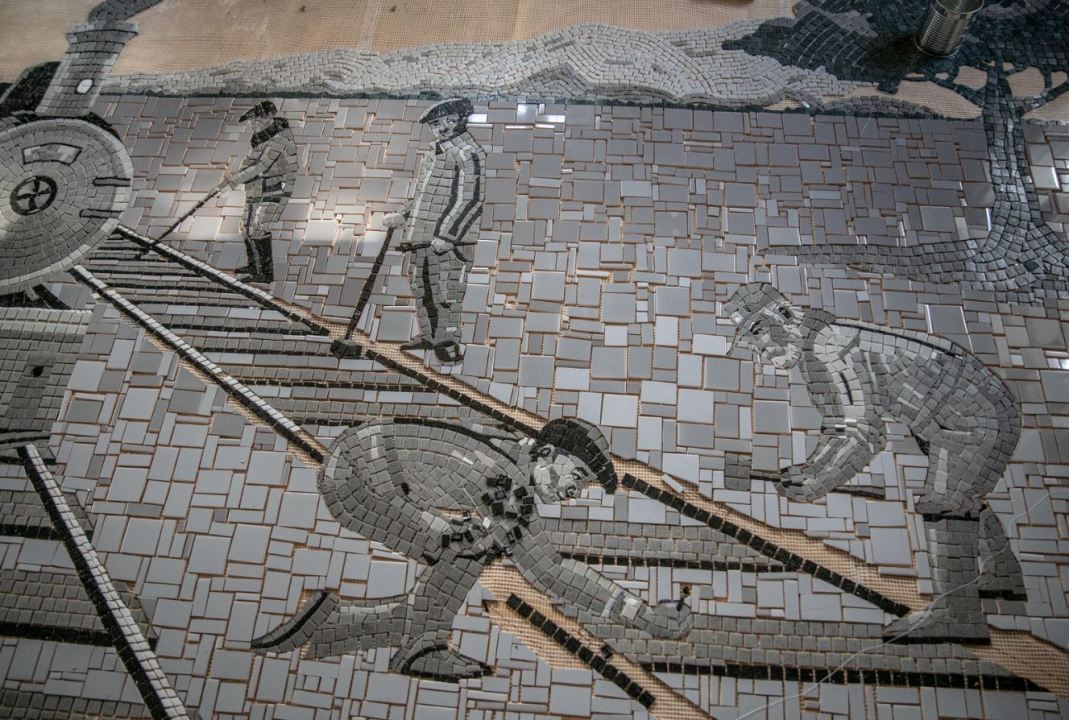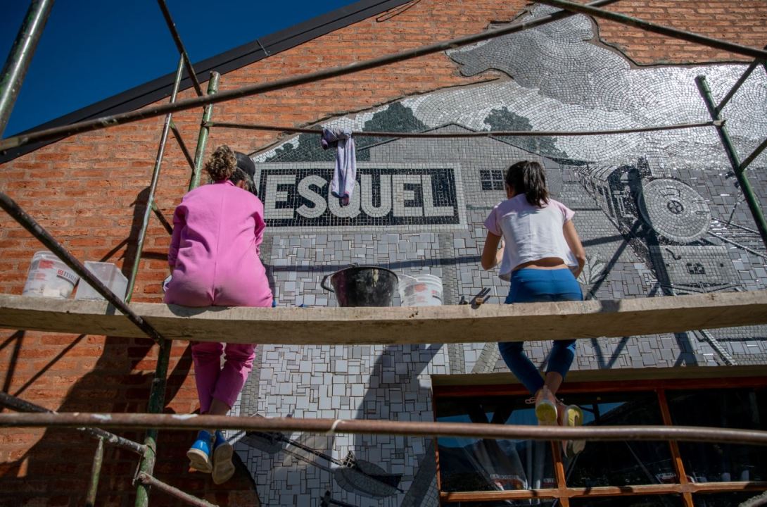 Hoy, en la estación de tren, en la pared que da al estacionamiento, desde lo lejos se puede ver la imagen gigante que mide 14 metros cuadrados. Parece una pintura y al irte acercando descubrís que está hecho con mosaicos.