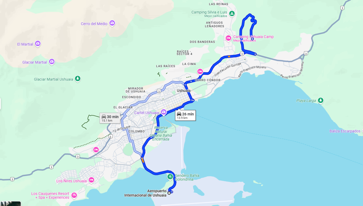 Para llegar al hotel desde el centro, se debe salir por la Ruta 3 y conducir por aproximadamente 7 kilómetros. Desde el aeropuerto hay que ir al este con dirección a Roque Sanchez Galdeano y luego tomar Av. Prefectura Naval Argentina y Héroes de Malvinas/RN3 hacia Ushuaia.