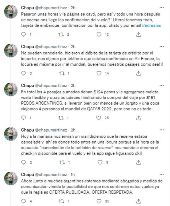 Sobre esto, el periodista Mauro Albornoz, que fue quien publicó primero la noticia en Twitter compartió: «Actualización pasajes a 10 pesos. Hay compradores que sacaron pasajes a Qatar por el mundial y están confirmados. Otros iniciarán acciones legales por vuelos cancelados. En otros años las empresas se hicieron cargo pero el error en este caso es de una magnitud importante».