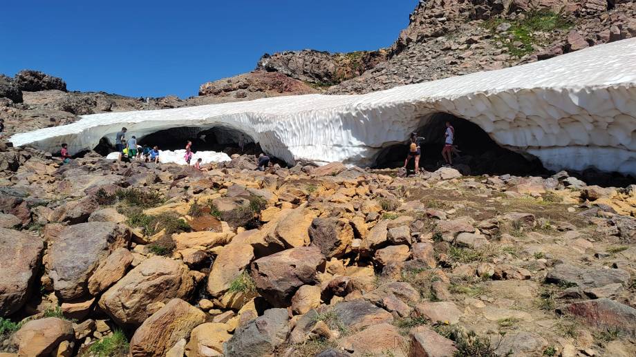 De ahí, fuimos a Copahue. El olor nos ahuyentó, vimos las piletas termales pero entre el olor y el color no nos invitó a sumergirnos. Cruzando el pueblo a 200 metros había «lenguas de hielo» que se transformaron en túneles por el deshielo: una imagen mágica. Nos sacamos un montón de fotos en ese fenómeno increíble. Parecía que llovía por el derretimiento y a su vez invitaba peligrosamente a entrar en esos túneles que dejaban ver la salida.