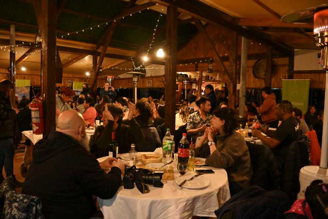 En un ambiente calefaccionado y ambientado con motivos gauchescos, el menú es asado patagónico que incluye cordero y carne vacuna (no incluye bebidas), además de una entrada con empanadas criollas y un tradicional postre argentino: flan con dulce de leche. Hay opciones para pasajeros veganos, vegetarianos y celíacos.