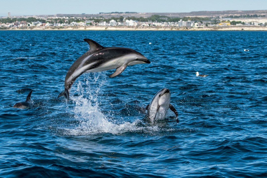 Más allá del mar, el espectáculo sigue. En Rawson, las salidas en lancha tienen un único objetivo: encontrar a las toninas overas. Estos pequeños delfines blanco y negro, parientes de las orcas y carismáticos, son veloces, juguetones y acrobáticos.