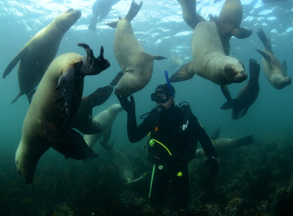 Buceo y snorkeling con lobos Frente a la costa, en la Reserva de Punta Loma, el mar es una puerta. Allí, en aguas protegidas, se practica snorkeling y buceo con lobos marinos. Ellos no temen: se acercan, juegan, giran con su danza torpe y afectuosa. Uno entra al agua y ya no es espectador: se vuelve parte de una coreografía entre burbujas, aletas y curiosidad animal.