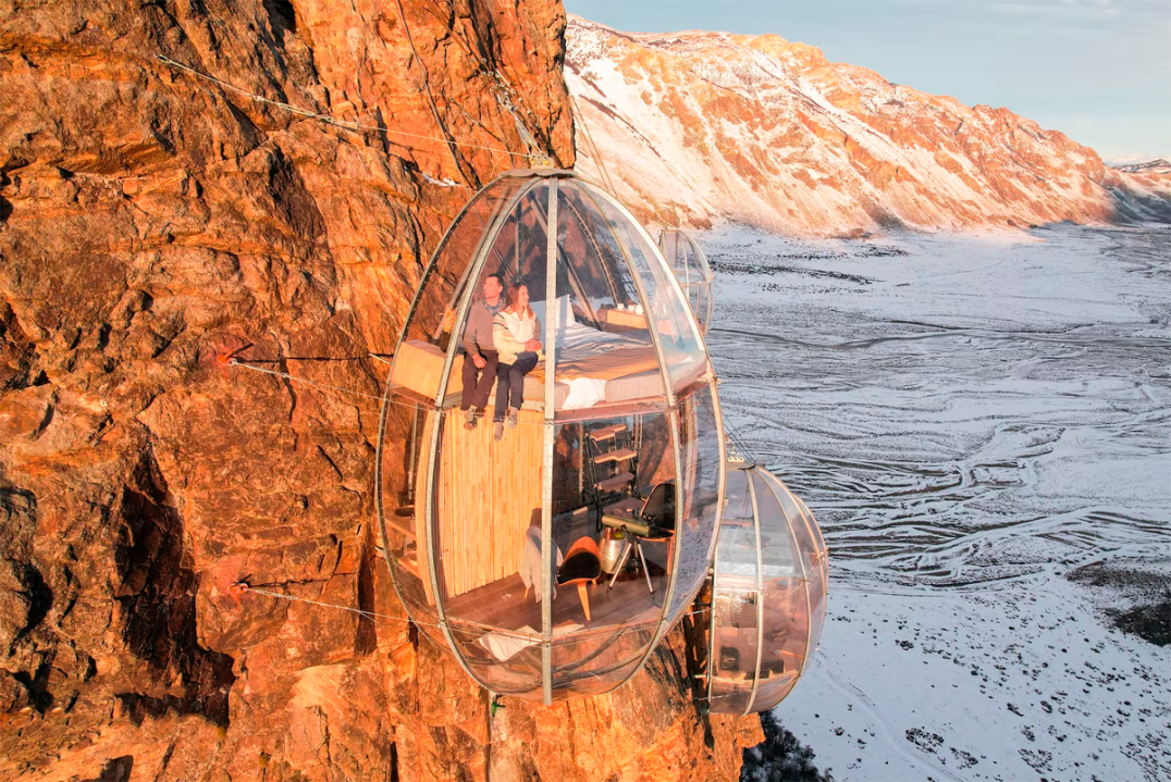 Dormir frente al majestuoso Fitz Roy será posible para los viajeros que quieran alojarse en las cápsulas ubicadas en un paredón de El Chaltén. Una experiencia única de hospedaje, amarrado a una roca y confeccionado policarbonato. ¿Te animás a vivir la sensación increíble de dormir en una cápsula flotando a 270 metros de altura?