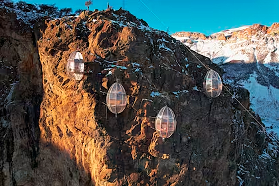 Dormir frente al majestuoso Fitz Roy será posible en 2024 para los viajeros que se animen a alojarse en las cápsulas ubicadas en un paredón de El Chaltén. Una experiencia única de hospedaje, amarrado a una roca de 270 metros de altura confeccionado policarbonato.