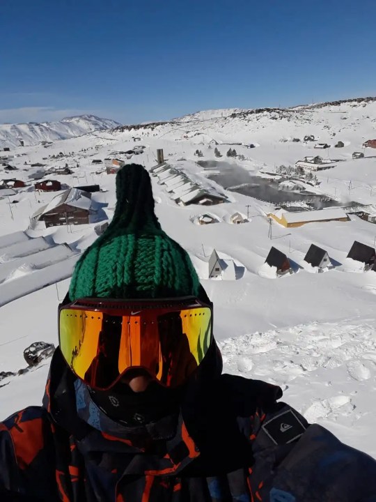 Ayer bajó a Caviahue para hacer las compras en el almacen: ya era tiempo de ir a buscar provisiones. Está a unos 8 km en línea recta y 19 por la ruta, hoy intransitable. Baja en unos 45 minutos cuando pone la tabla de splitboard en modo snowboard. Y vuelve desde el almacen con la mochila de 60 litros cargada en unas dos horas y media, con la tabla en modo esquíes de travesía con piel símil foca para adherirse y no irse para atrás en el ascenso, ya que Copahue está a 2.050 msnm, es decir 450 metros más arriba. «Tenía que ir», dice. «Aparte mañana es mi cumple», agrega. Eso sí, la nieve estaba buena: «Mucha, suelta para caminar, pero rebien», amplía.