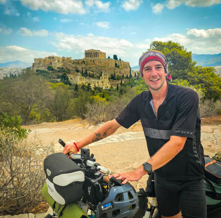 Grecia. La bici lo llevó hasta el mirador de la Acrópolis de Atenas.