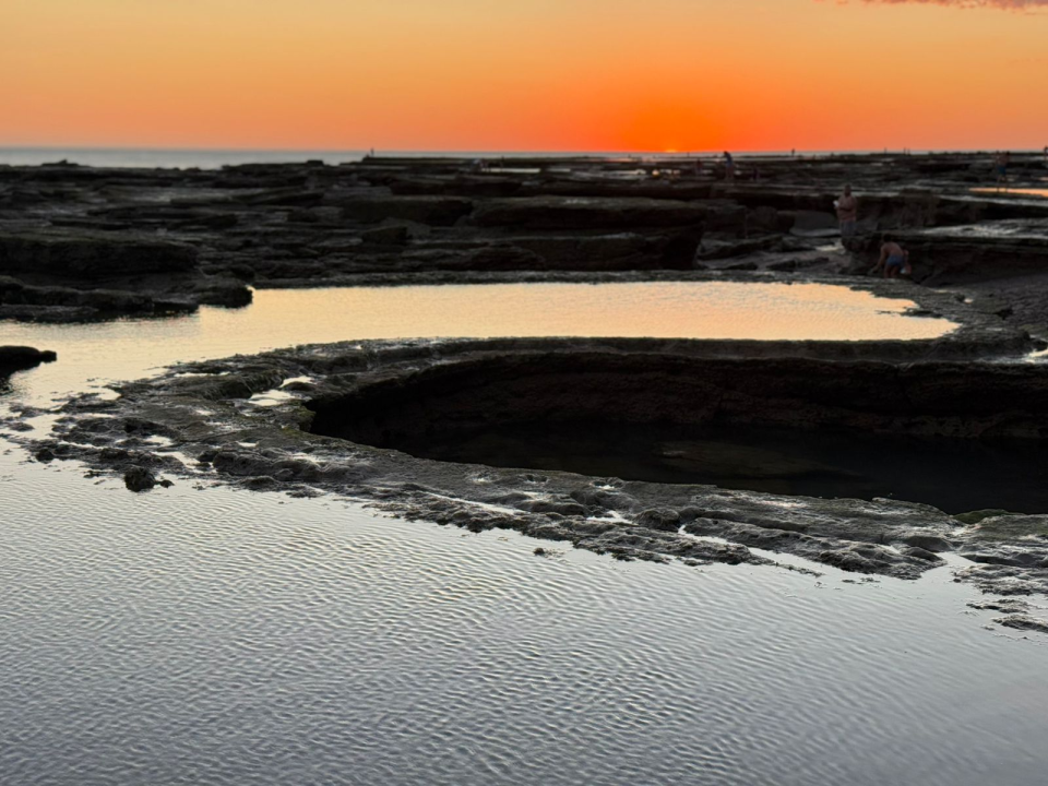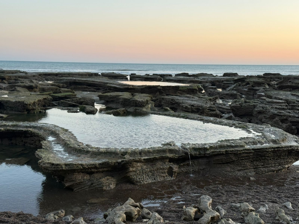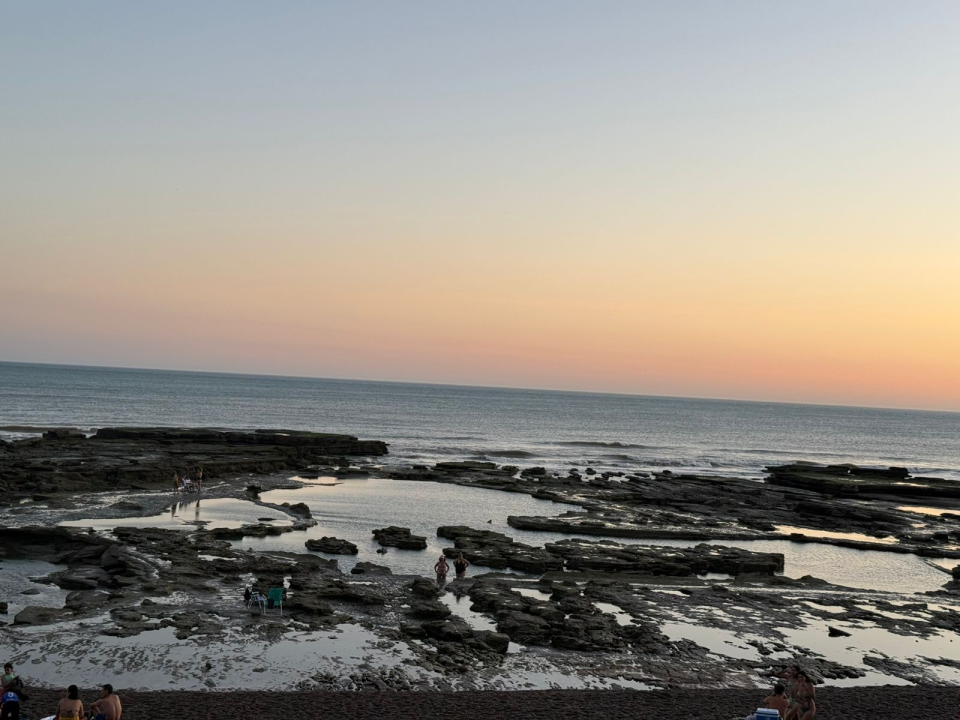 Cuando el sol empieza a caer sobre el Camino de la Costa y la marea baja coincide con el final del día, La Lobería regala una de sus postales más buscadas del verano rionegrino, los piletones naturales que quedan al descubierto entre las rocas, espejos de agua salada que reflejan el cielo anaranjado del atardecer.